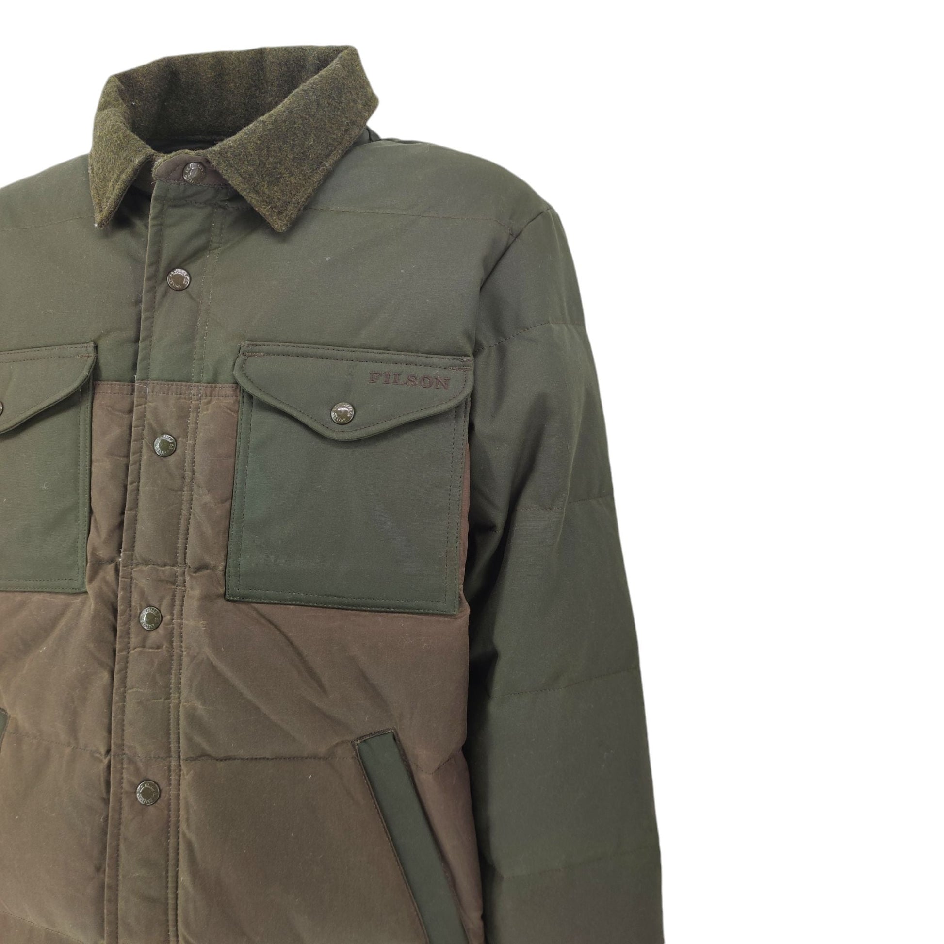 La giacca Filson Down Oil Shelter in colore Otter Green è pensata per offrire una protezione superiore contro il freddo e l'umidità grazie alla combinazione di materiali di alta qualità e design robusto. Realizzata in cotone con finitura a olio e rinforzata nelle zone più soggette a usura, questa giacca è isolata con piumino d'oca da 650 fill power, che garantisce calore e leggerezza. Dettagli come il colletto e i polsini in lana, insieme alle tasche per scaldare le mani e al cappuccio regolabile, ne fanno una scelta ideale per chi cerca praticità e stile nelle condizioni climatiche più difficili.